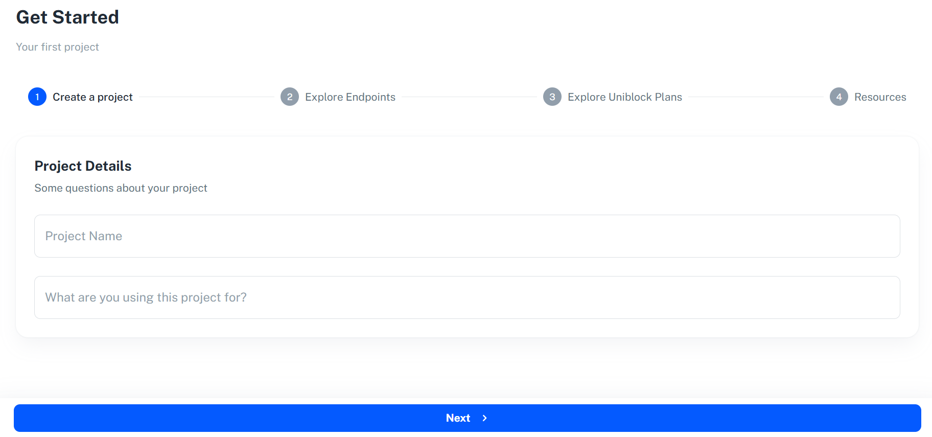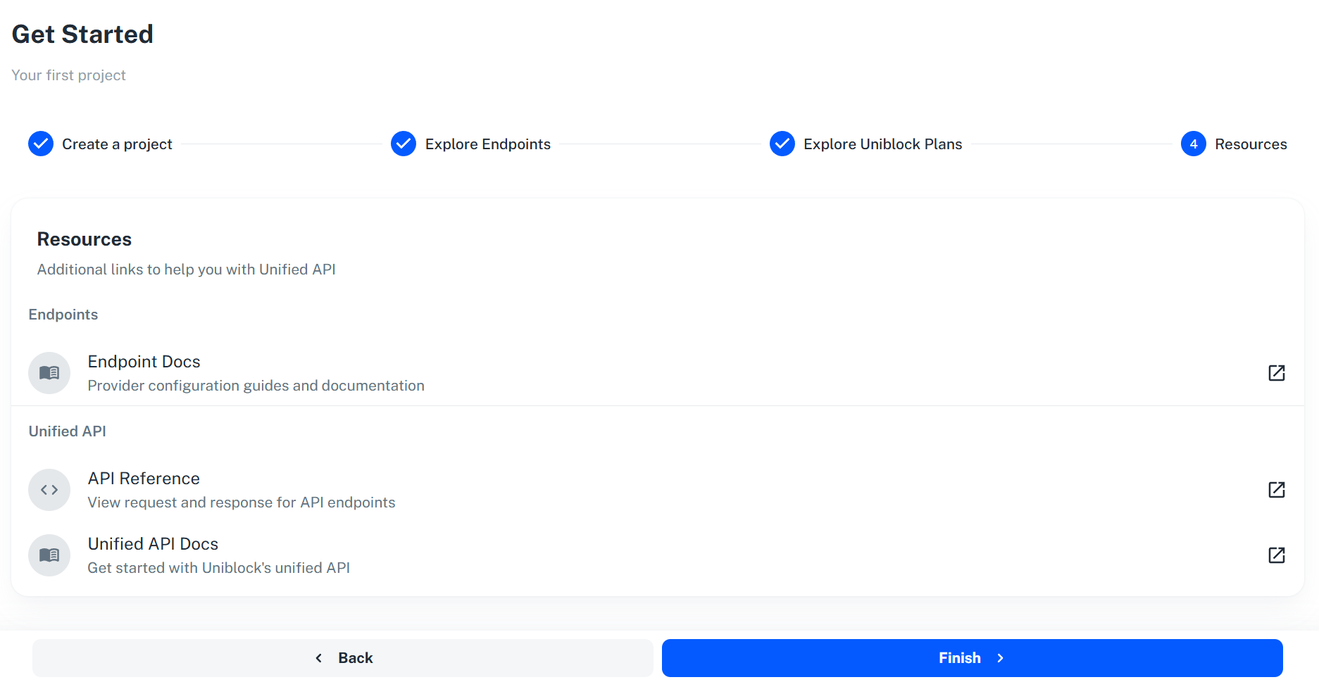 After clicking theFinish button, you have just created your first project on Uniblock. You will be redirect to the project overview page automatically.