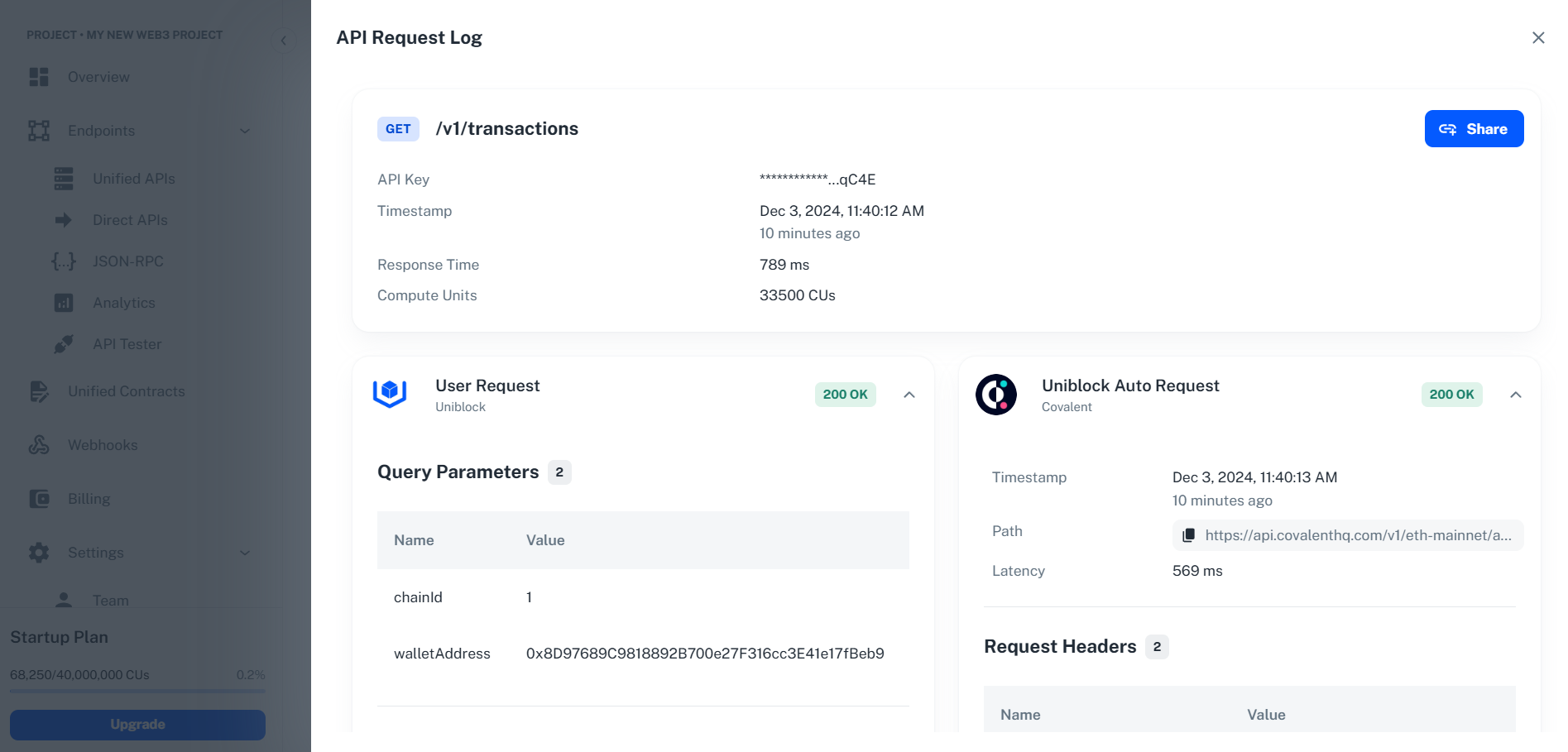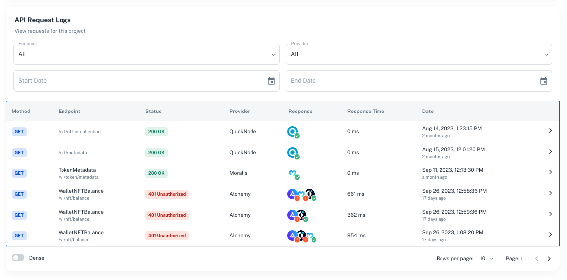 Use the filter options to narrow down logs based on specific criteria, such as providers, status codes, endpoints, or time frames. The search bar allows you to quickly find logs containing specific keywords or error messages.Ready to get started with Uniblock?